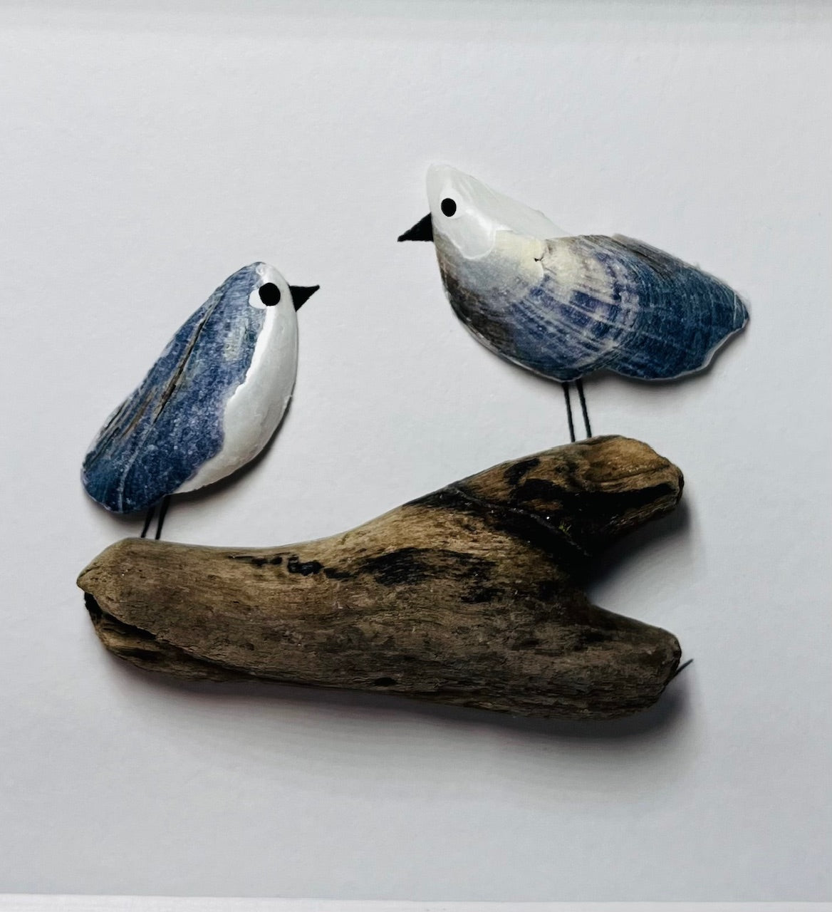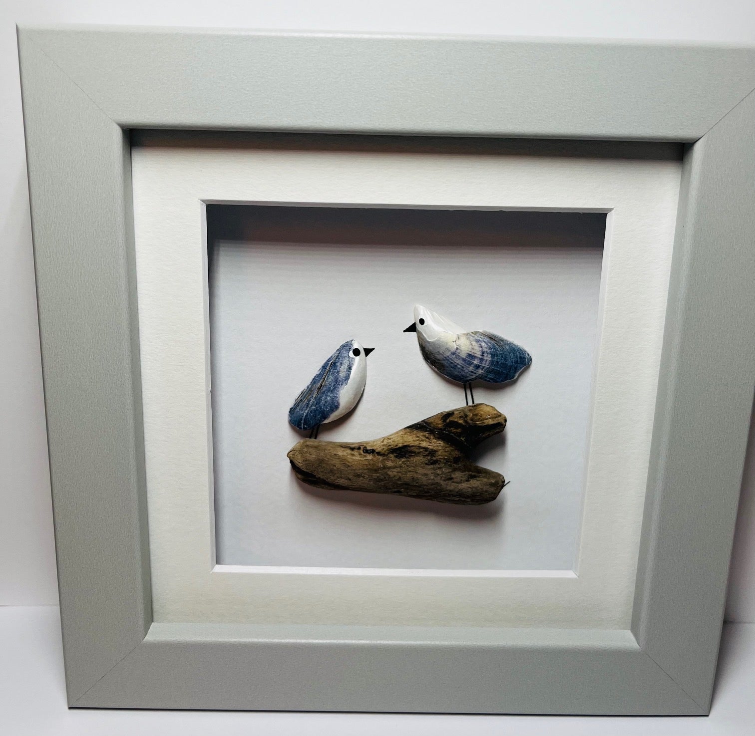 This is a handmade picture made using Scottish Mussel shells. There are 3 small gulls sitting on a piece of pretty driftwood in a pale grey frame.
