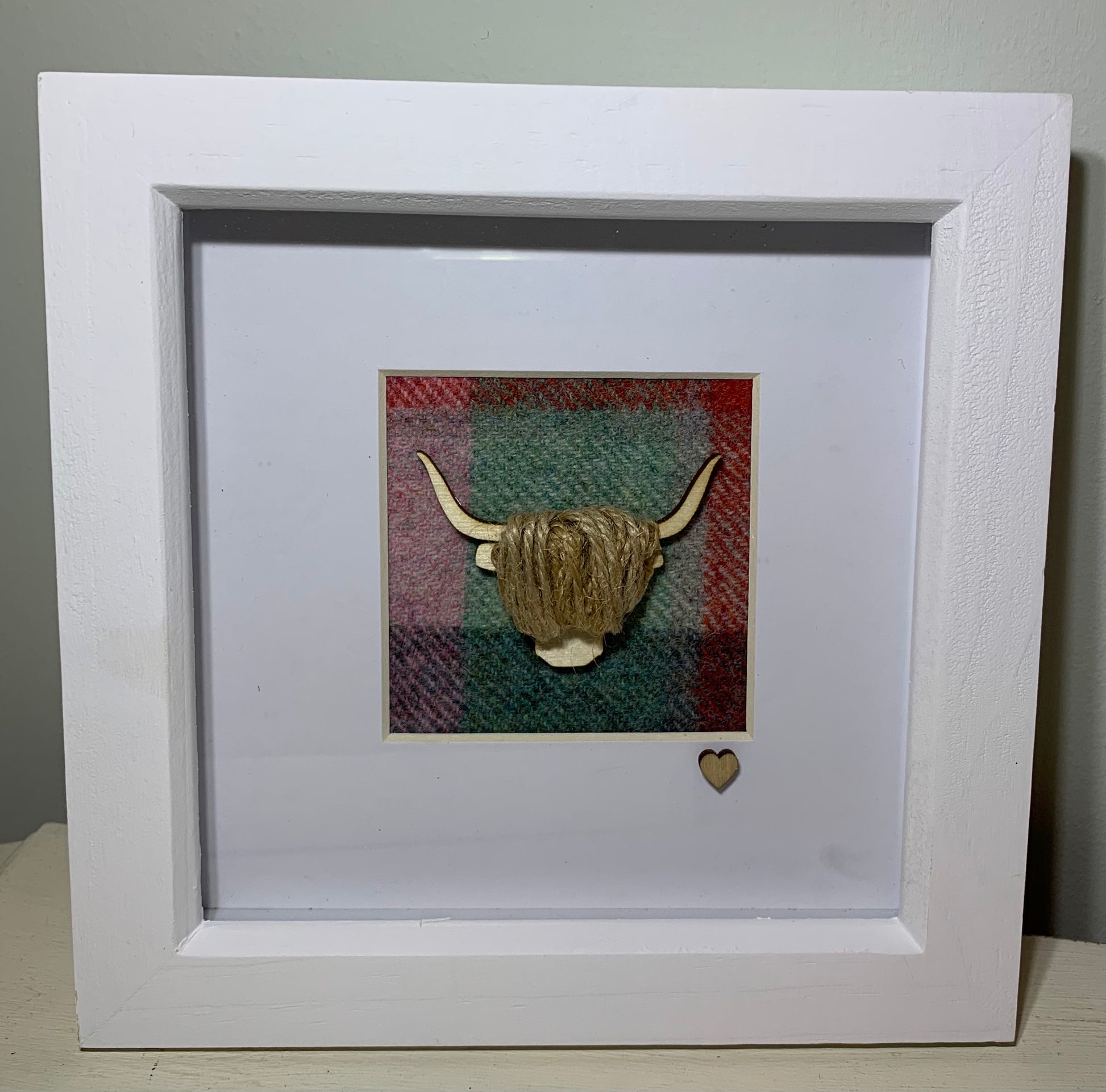 This is a handmade picture of a Highland Cow with shaggy hair, framed on a beautiful tweed background. This is in a white wooden frame.