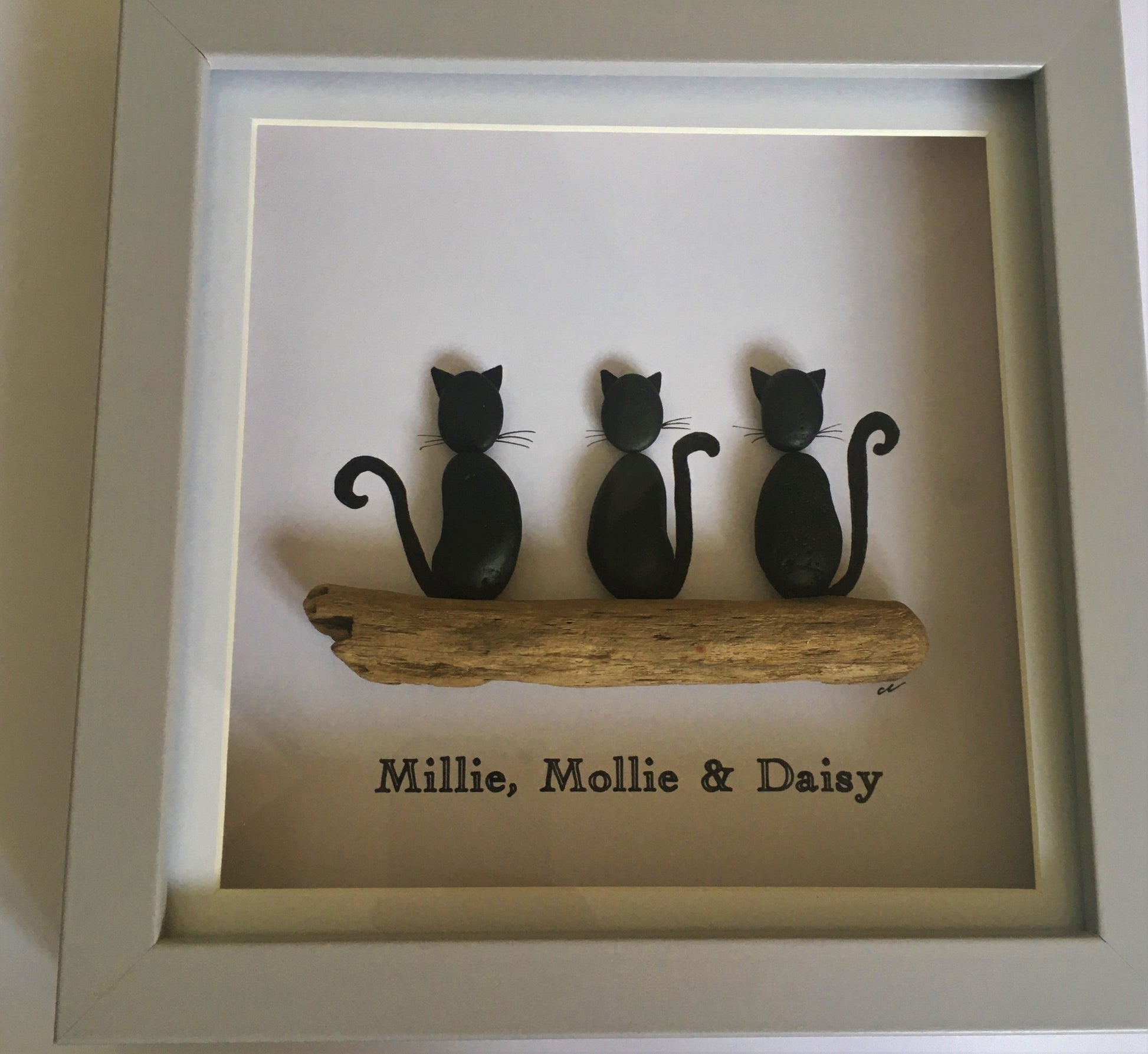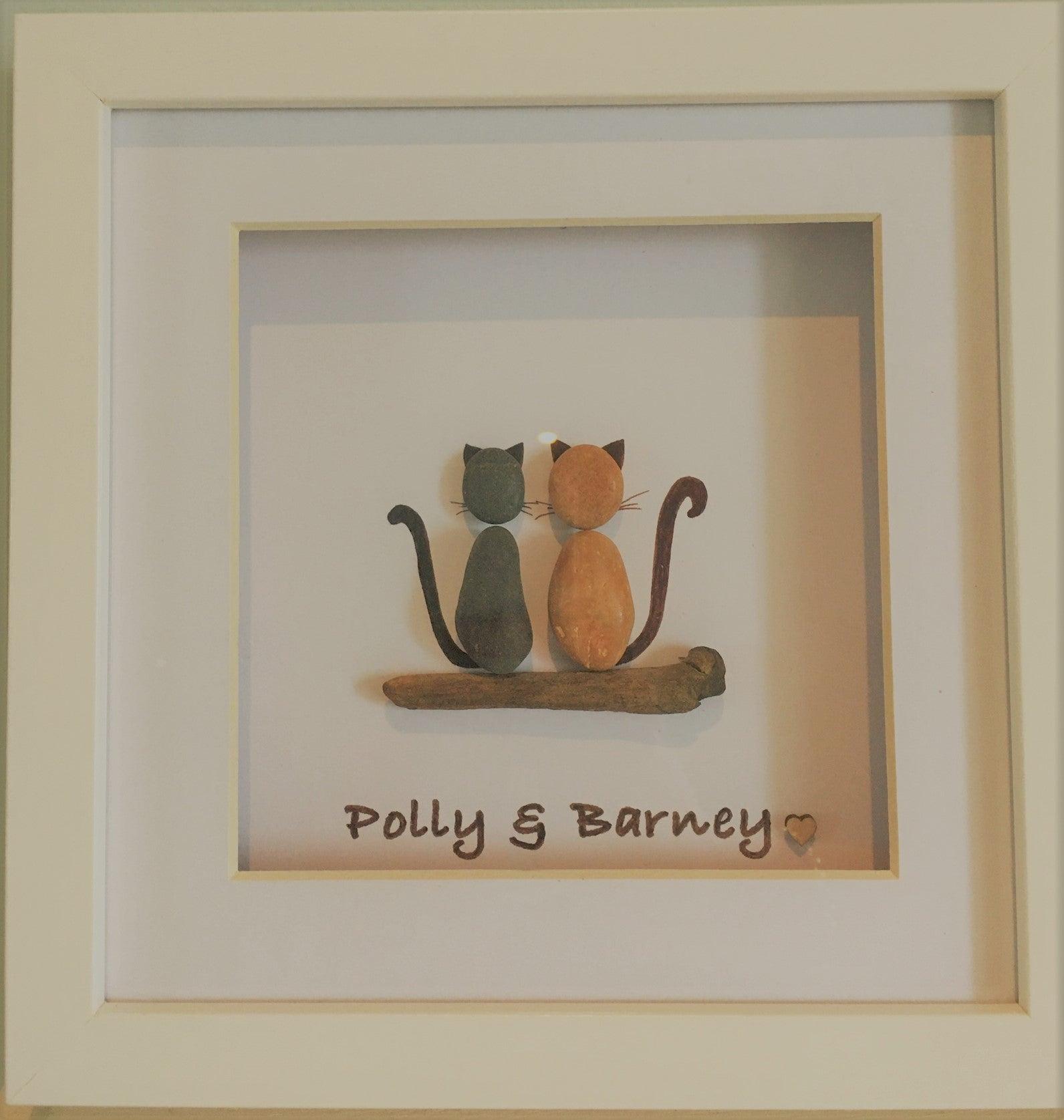 This is a handmade picture with cats which are made using pebbles. These can be personalised with the pet names and the colour of the cats whenever possible. I can also do fewer or more cats if required and can add a wooden heart. I have white, black, grey and wooden frames available. Please just let me know if you have any queries at all or any specific requests.