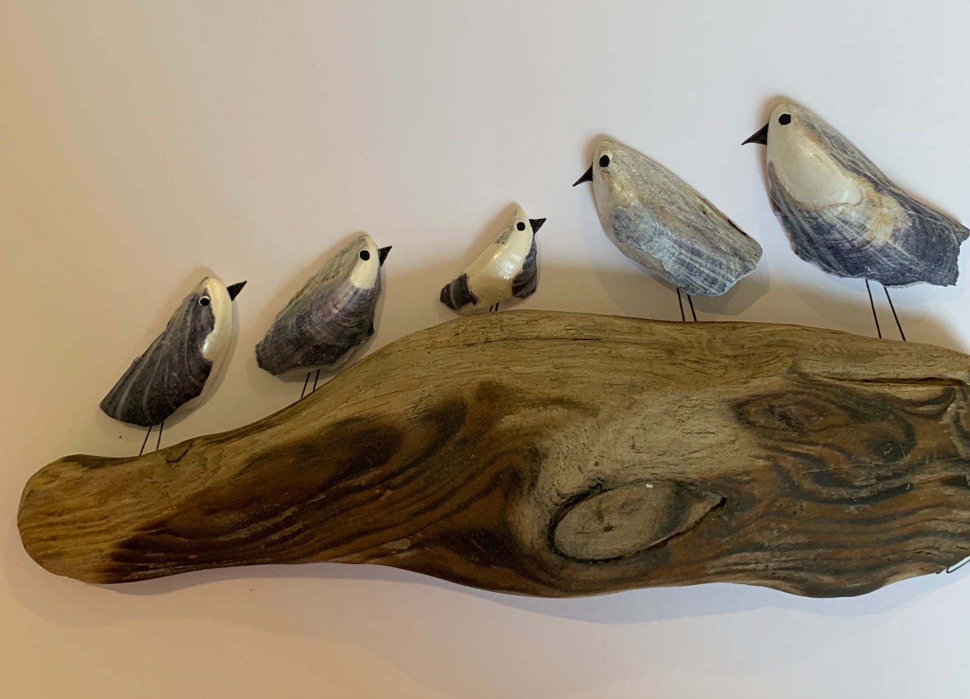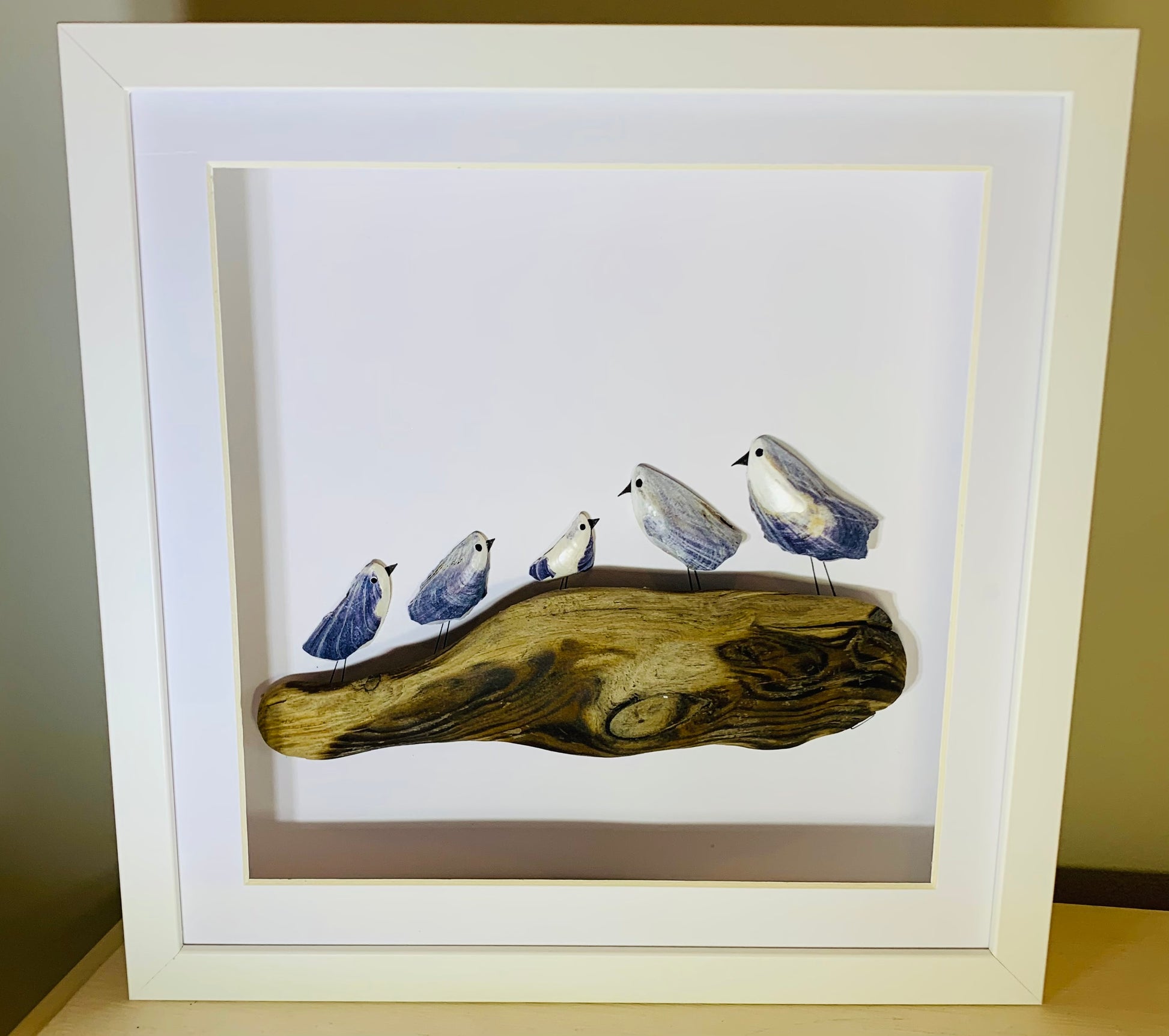 This is a handmade Scottish Sea Gulls picture with a family of 5 birds. It has been made with Scottish Mussel shells and a beautiful piece of driftwood. It is in a deep white box frame with a glass front.