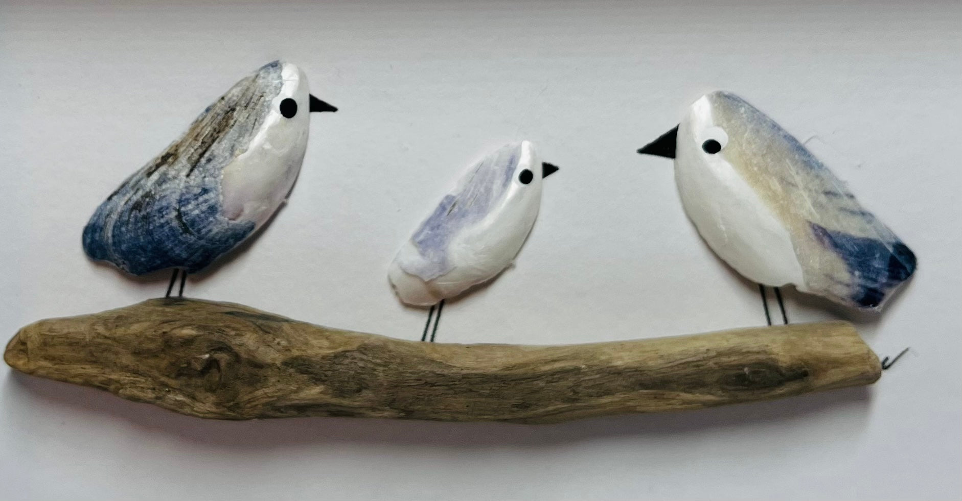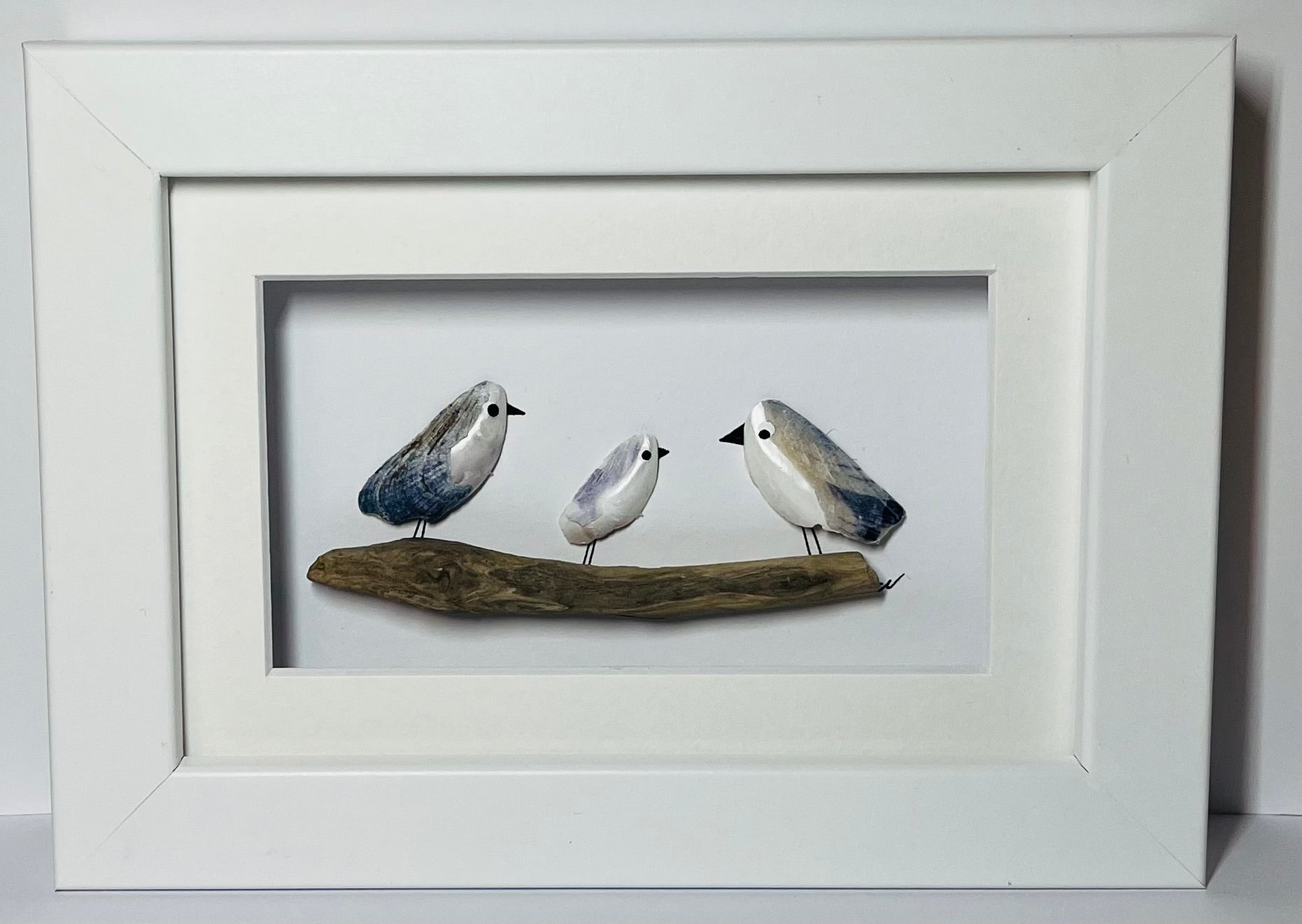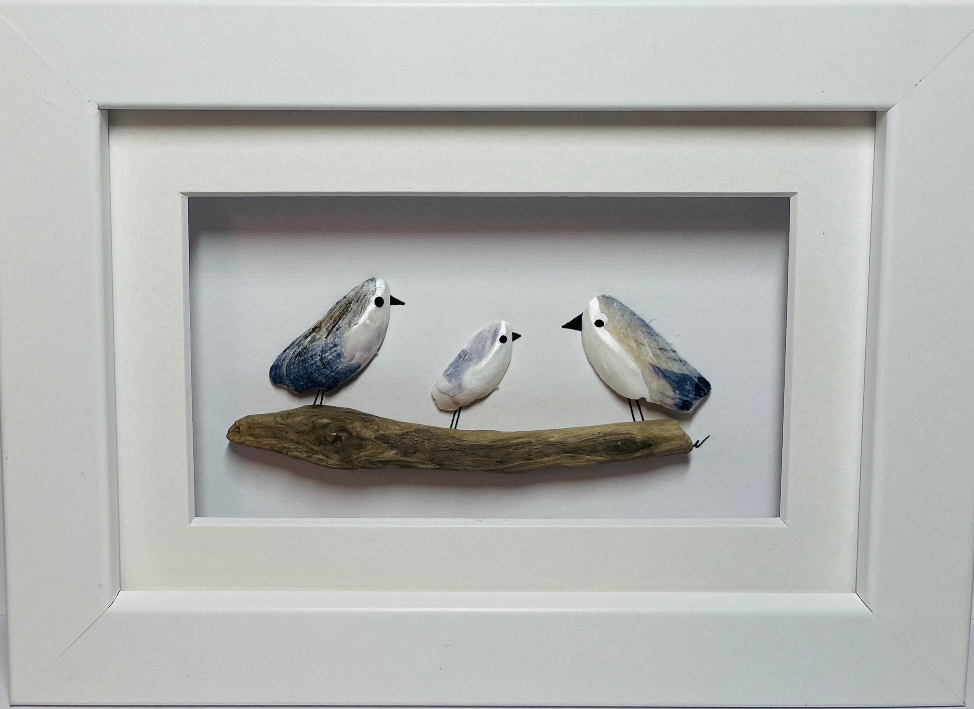 This is a handmade picture made using Scottish Mussel shells. There are 3 small gulls sitting on a piece of pretty driftwood.