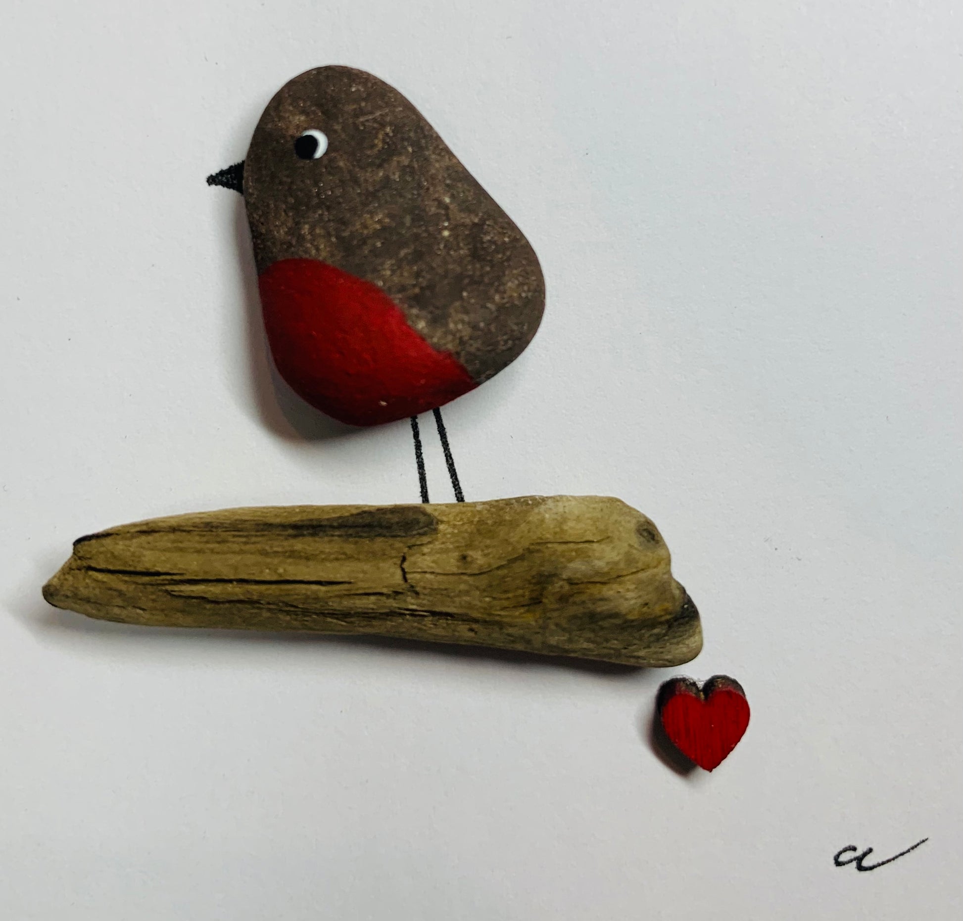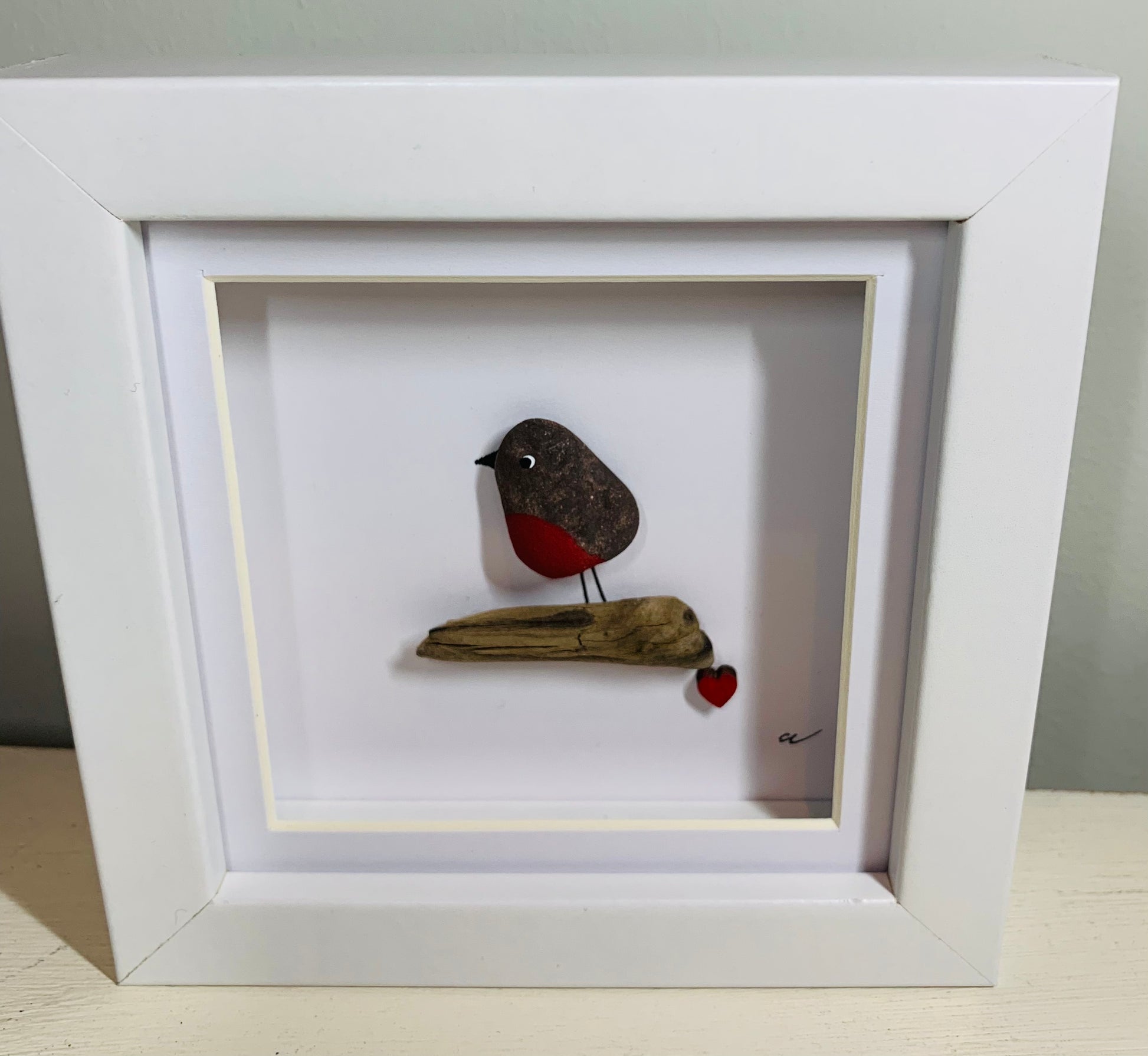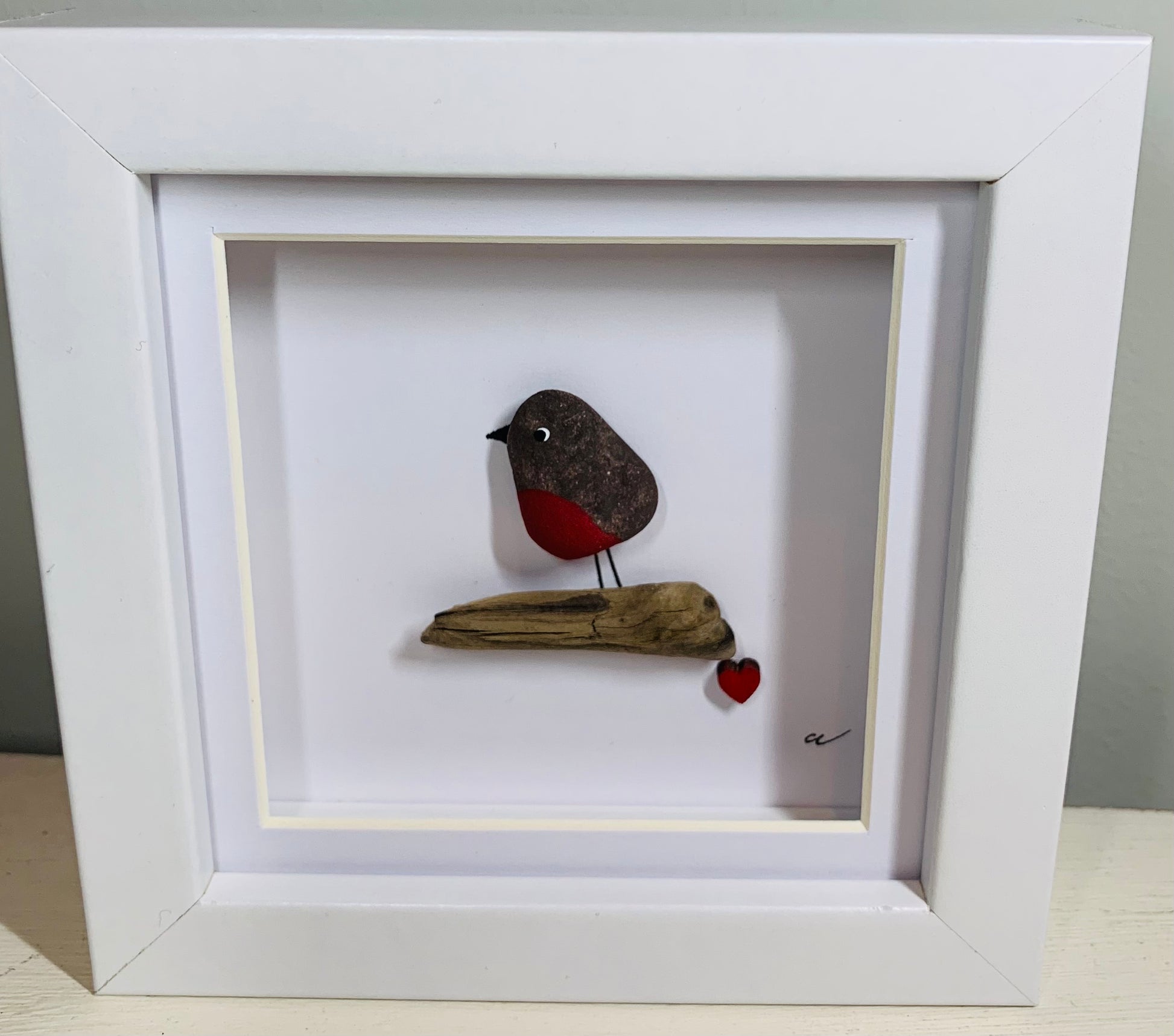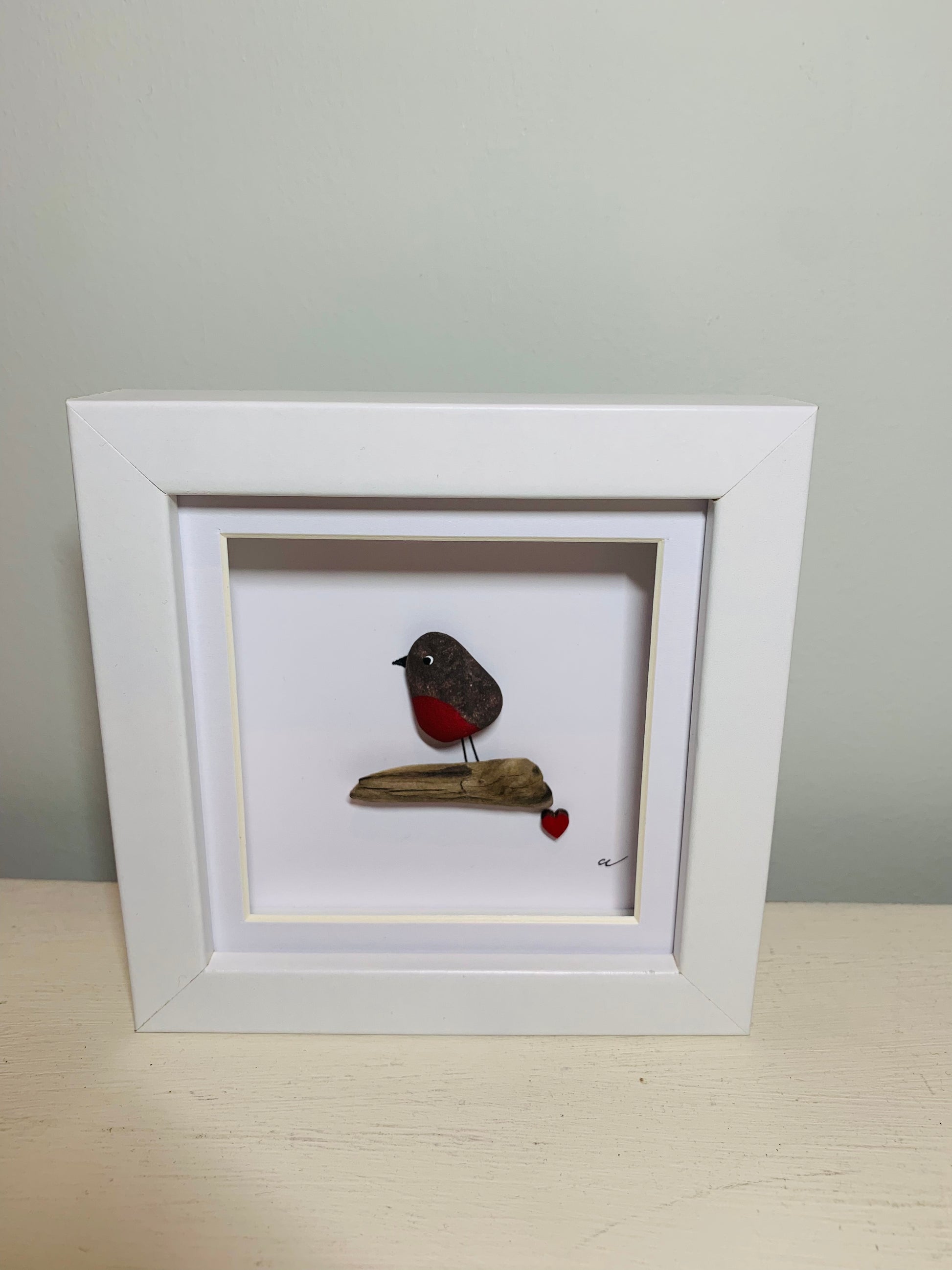 This is a small picture of a Robin on branch with small red wooded heart. The Robin has been made from a small pebble. This frame can either be hung on a wall or it can just sit on a shelf or other flat surface.